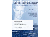 Informationsvortrag ![]() Fr 14.11.2025, von 17:00 bis 18:30 Uhr Kategorie : Gesundheit & Wellness Veranstaltungsort Sicherheitszentrum Dr. Schwaiger-Straße 17 8490 Bad Radkersburg (Seminarraum) Preis der Veranstaltung Preis : Eintritt frei (Spenden sind willkommen) Vorverkauf : Eintritt frei (Spenden sind willkommen) Ermäßigung : Eintritt frei (Spenden sind willkommen) weiterführende Informationen Veranstalter Service & Option Bruno Gröning - Kreis für natürliche Lebenshilfe Tel : 0664 8506657 EMail : ![]() Homepage : bruno-groening.org Beschreibung Die außergewöhnlichen Heilungen, die durch Bruno Gröning eingetreten sind, haben eine neue Epoche der geistigen Heilweise eröffnet. Bruno Gröning hinterließ das Wissen über die Aufnahme einer natürlichen Heilkraft, die jedem Menschen zur dauerhafter Gesundheit verhelfen kann. Heute wie damals geschehen weltweit Heilungen von seit Jahrzehnten bestehenden chronischen Krankheiten, aber auch von Drogenabhängigkeit und anderen Suchterkrankungen. Dies belegt eine Vielzahl von Erfolgsberichten, die von Ärzten der Medizinisch-Wissenschaftlichen Fachgruppe sorgfältig geprüft und mittels medizinischer Befunde unabhängiger Ärzte dokumentiert werden. Um Bruno Grönings Wissen den Menschen weltweit zugänglich zu machen, geben Ärzte, Psychologen und Heilpraktiker der Medizinisch-Wissenschaftlichen Fachgruppe ihre Erfahrungen durch regelmäßige Vorträge im In- und Ausland kostenlos weiter. Rahmenprogramm Geheilte berichten, wie sie gesund geworden sind. Referenten vermitteln Bruno Grönings Wissen, sodass dessen Aussage „Es gibt kein Unheilbar!" für jeden erlebbarwerden kann. | Jetzt Ihre Veranstalungen KOSTENLOS in unserem Veranstaltungskalender Netzwerk eintragen! --> weitere Informationen Dir gefällt die Region Südoststeiermark? Unser Netzwerk Wussten Sie, das Ihre Veranstaltungen nicht nur hier auf Veranstaltungskalender.net erscheinen, sondern auch auf vielen weiteren Internetadressen unseres Domain Netzwerkes und auf den Internet Adressen unserer Partner! Wussten Sie, das Sie mit Ihrem Veranstaltungskalender.net Account nun auch kostenlose Inserate und Kleinanzeigen auf unserem Inserate Marktplatz www.inserate.net aufgeben können. ![]() |